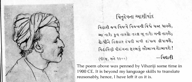 Bahecharlal, a man of indifferent fame, but blessed with high intelligence and quick grasp, known in Kathiavaad as ‘Viahri’ - the psedonym under which he wrote poems – was born in Sihor town in the Bhavanagar principality to Trikamji Purushottam and his wife Gangaabai on 22nd March 1866 AD, corresponding to Chaitra’s 6th declining lunar phase in Vikram Samvat 1922 in the Patidar clan.